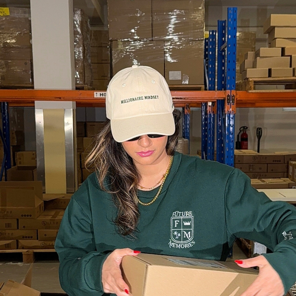 Get ready to add some delusion to your everyday wardrobe with the Millionaire Mindset cap! This cream cap is the perfect accessory for business owners to wear while we pack orders, email customers, work on our ads and create content. Features an embroidered dark green logo on the front and Future Memories embroidery on the side.